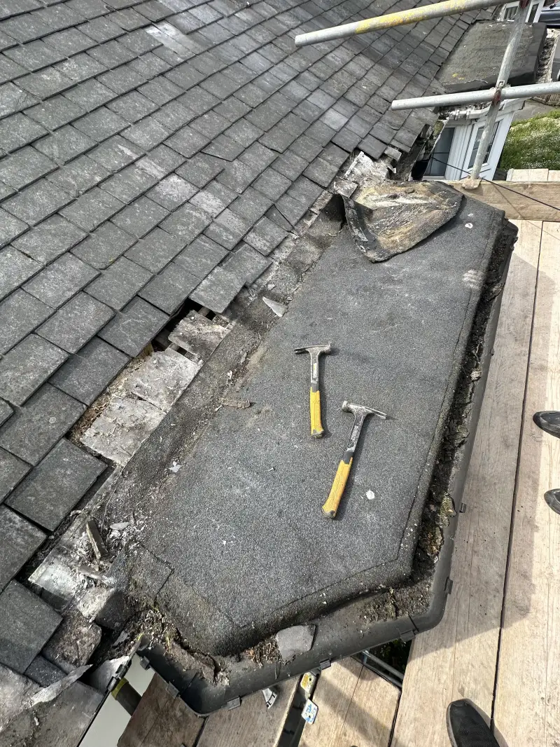 We stripped off the old felt roof covering to reveal some rotten timber boards. We stripped out the rotten timber and replaced with a structural moisture resistant OSB3 board. Our qualified operatives then proceeded to install the 1.2mm thick EPDM rubber roof covering.
