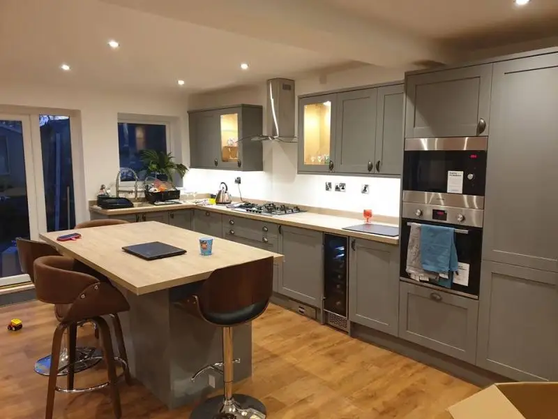 A recent kitchen refurbishment in Fazeley, Tamworth that we worked on. There was a dividing wall with archways that we opened up with the aid of a new steel beam. Another wall that we knocked down to open the space up and created a new opening in the external wall for a new french door. We replaced the existing french doors and replaced the arched window with a normal squared one, this let in loads more light to the previous arrangement. The walls and ceilings were then plastered and new LED spotlights fitted. We also stripped out the existing kitchen, rearranged and replaced it with a new grey shaker style kitchen with oak laminate worktops. We also fitted a plinth vacuum which was something we had never fitted before.