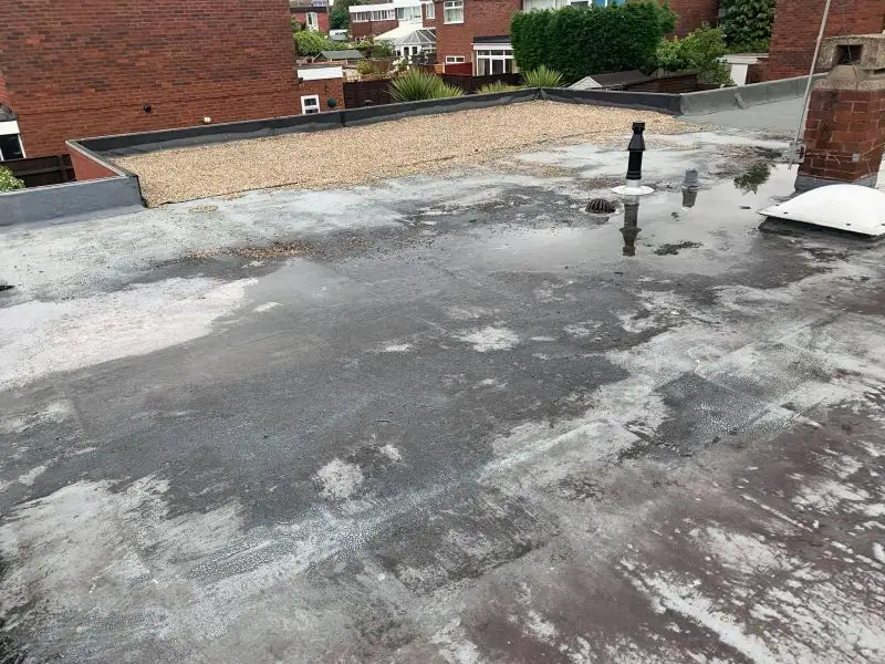We stripped off the previous roofing membranes to reveal the 50mm Woodwool slab. We then over boarded the woodwool slab with Structural moisture resistant OSB3 boards screwed into the joists. This was a request by the customer as he felt that the current boarding was too uneven causing standing water. We then applied a 2mm torch on underlay felt followed by a 4.5mm mineral torch on Capsheet. All edging details were also finished in the same material. This roofing system carries our standard 15 year manufacturers guarantee. All waste was removed from site and disposed of in the correct manner.