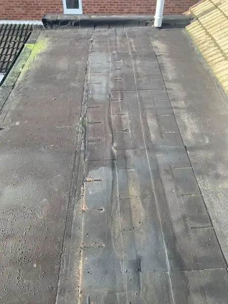 One of the jobs we did this week was this little residential flat roof replacement in Belgrave, Tamworth. The customer had called to say that they had a leak to their bedroom roof and required a roof repair. On investigations it was observed that the roof had previously been repaired, to a fashion, by what the customer now believes to be cowboys. They had used felt shingles, designed to be on a sloped roof, nailed them down puncturing the existing membrane several times and then covering the roof with bitumen paint. Unfortunately, the customer was not able to gain access to see what they had done. Also, the previous roofers charged nearly twice the amount to repair the roof than we charged to replace it.